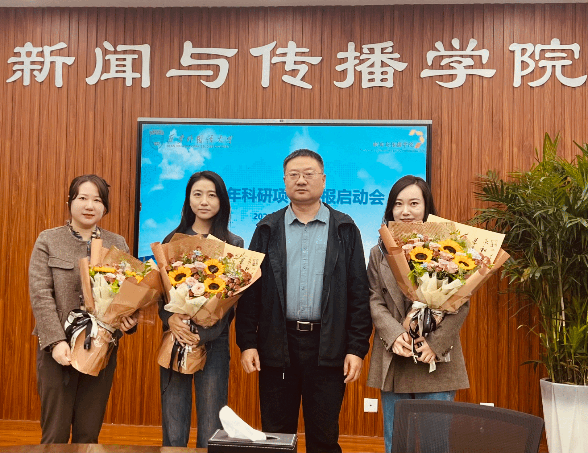 会上,副院长李鹏(主持行政工作)向本年度获批国家社科基金项目的陶禹舟博士,获批教育部人文社科基金项目的张峰博士以及获批陕西省社科基金项目的张聪副教授献花致贺。党委书记张中旺向为本年度向老师提供科研申报辅导服务的李鹏教授、张秀丽教授、高晓瑜教授和王凤仙副教授等教授代表赠送青松绿植,感谢他们在申报辅导环节的毫无保留与倾囊相授。