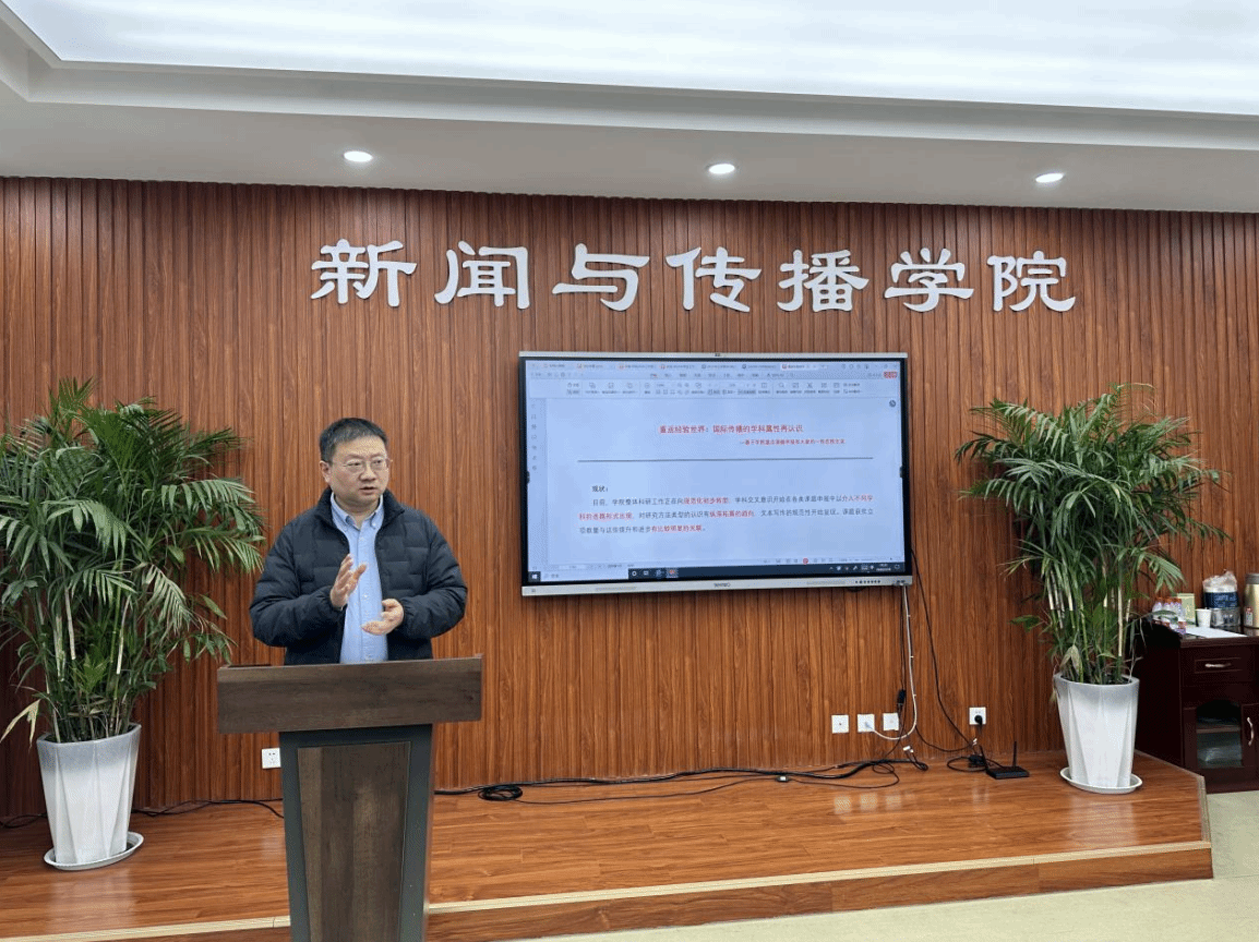随后,副院长(主持行政工作)李鹏以“重返经验世界:国际传播的学科属性再认识”为题,以学院重点课题申报为切入点,与全体教师进行了深入交流。他首先肯定了学院科研工作向规范化转型的初步成效,同时指出当前学院科研存在学科本位意识浓厚、缺乏对“真实问题”的科学判定能力、方法论意识薄弱、申报心态迟疑等问题。他强调,国际传播研究的对象是被国家、平台、制度、资本、算法与社会行动者共同结构化的经验世界,必须重返经验世界,并从政治学、社会学、历史学、心理学、哲学等多维度进行了系统阐述,为老师们提供了理论指导和具体行动指南。