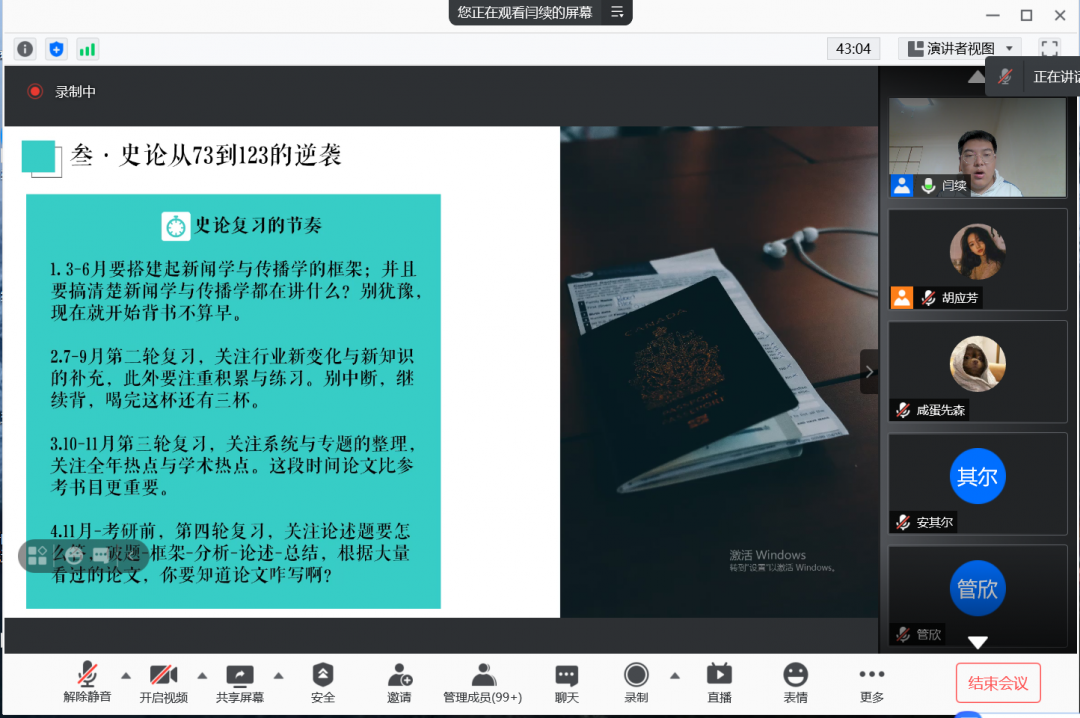 关于备考方面,前期打好基础,后期复习的时候才会更加系统和有针对性。细化考研目标,制定阶段性学习目的是非常高效的一种方法。同时,她也提醒同学们,要注意复试的时候回答问题的逻辑,重视条理性清晰;还要多关注一下生活中的热点政治问题,用政治学的思维去看待和分析问题。