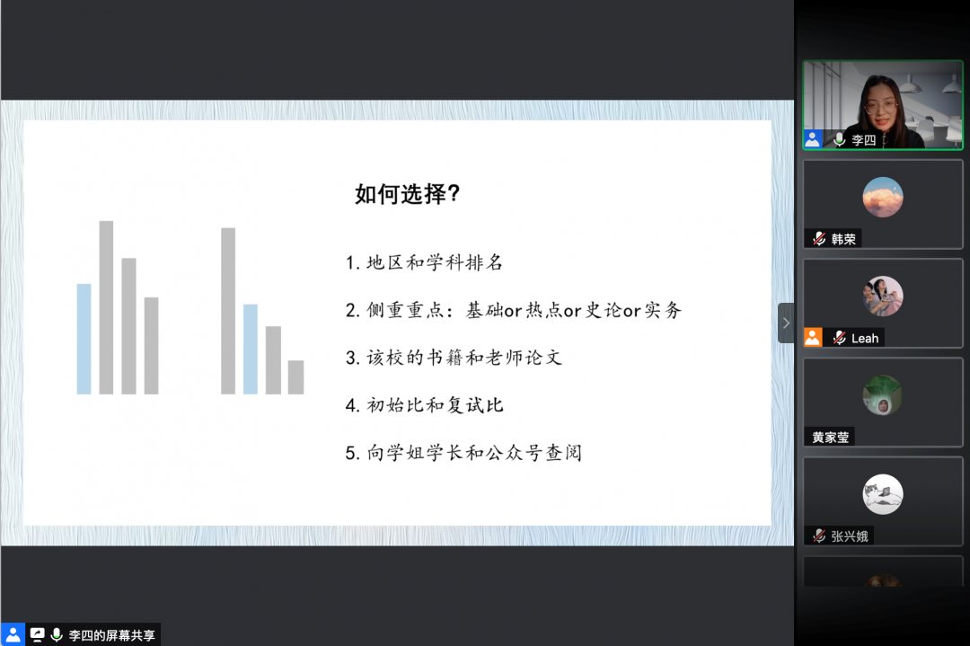 李倩分享到:“考研如何选择是非常重要的,大致可以从以下五方面去考虑。分别是:地区和学科排名、基础or热点or史论or实务、该校的书籍和老师论文、初试比和复试比、向学长学姐和公众号查询。同时,在具有较稳定的planA情况下,一定要准备planB,山外有山,切勿盲目膨胀,更不要急于选择,认真思考想清楚自己要什么。当然,一手好字也至关重要,卷面整洁,给改卷老师一个好印象。”