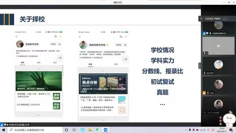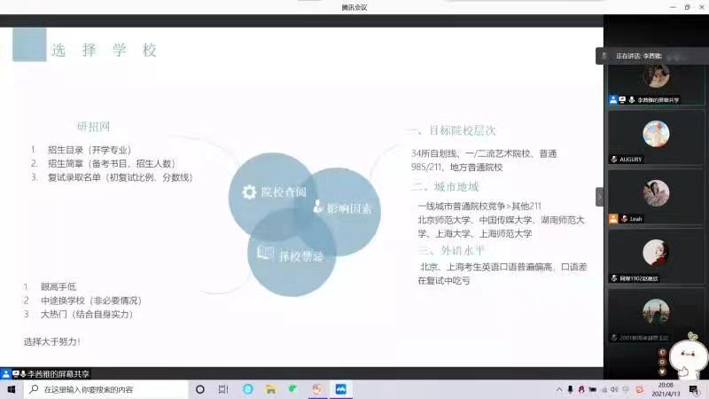 “要从择校择专业、报录比、历年试题、初复试占比等做好前期准备。”李茜雅向同学们详细地讲述了考研前期选择的流程和方向,“好选择胜过努力。”关于陕西师范大学广播电视专业考试,李茜雅从大纲、要求等方面为同学们分享经验,并强调一定要反复背书加强记忆,多关注热点、总结答题模板,还要注意训练答题速度。
